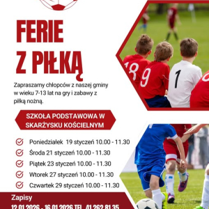 Miło nam poinforować, że podczas tegorocznych ferii zimowych w Szkole Podstawowej w Skarżysku Kościelnym odbywać się będą gry i zabawy z piłką nożną. Zajęcia organizuje Gminny Ośrodek Kultury, które przeznaczone są głównie dla chłopców w wieku 7-13 lat. Zapisy od 12.01 do 16.01. Harmonogram zajęć według rozpiski na plakacie.