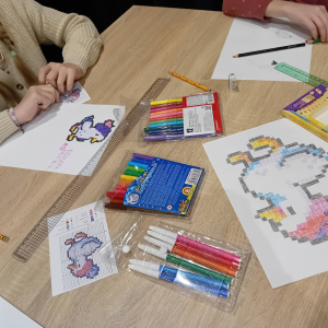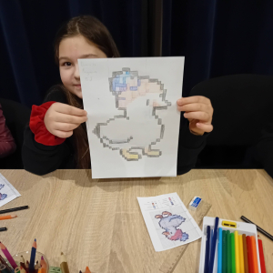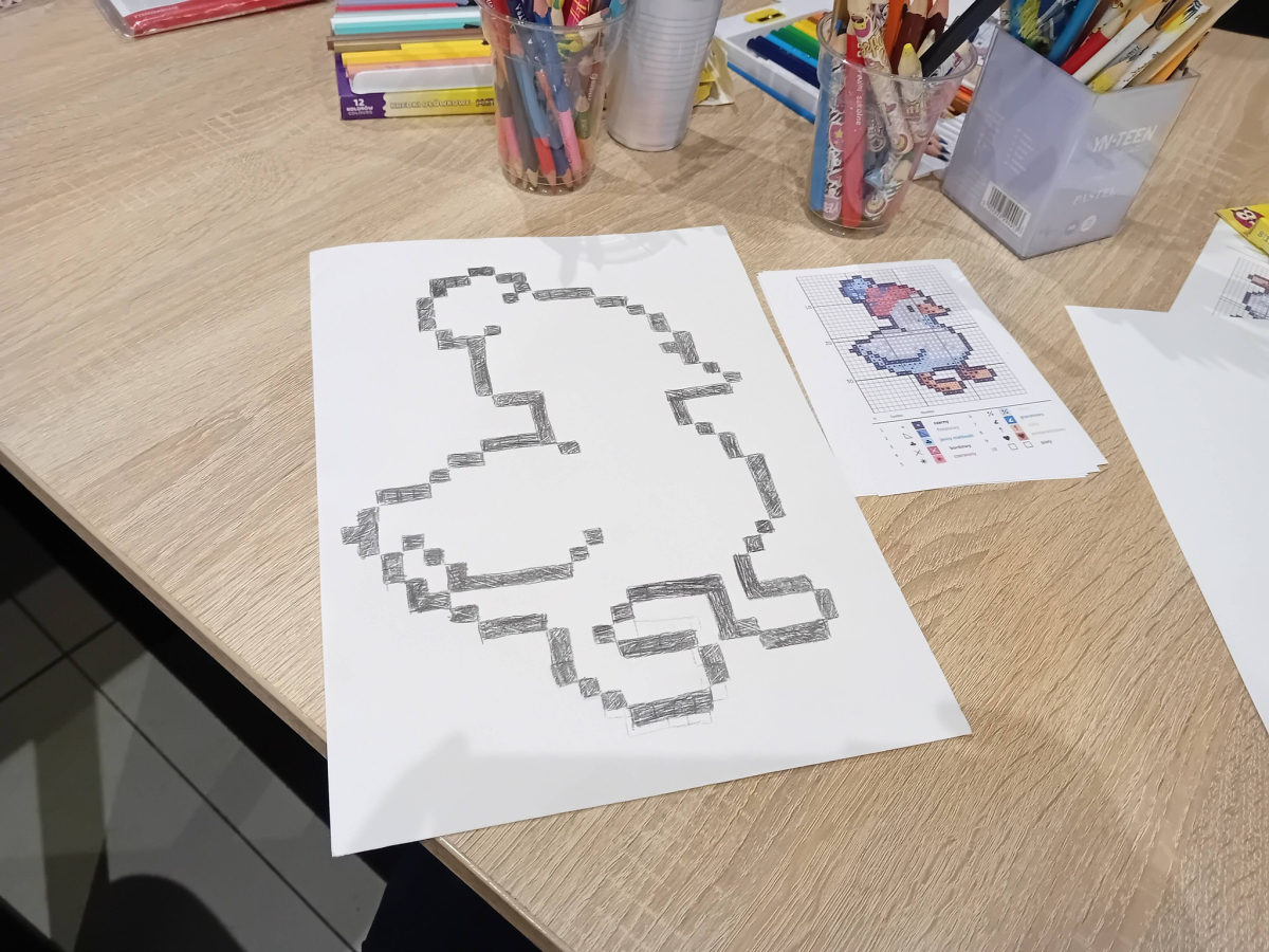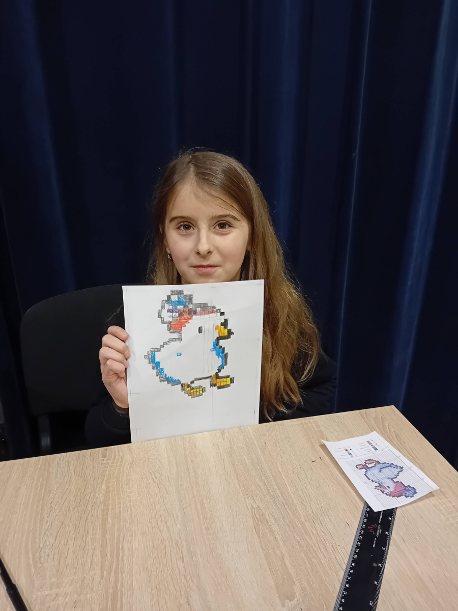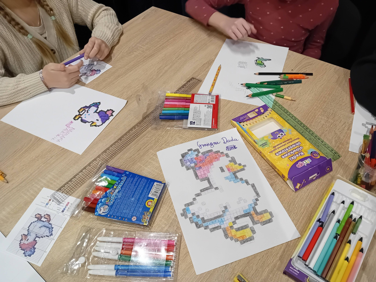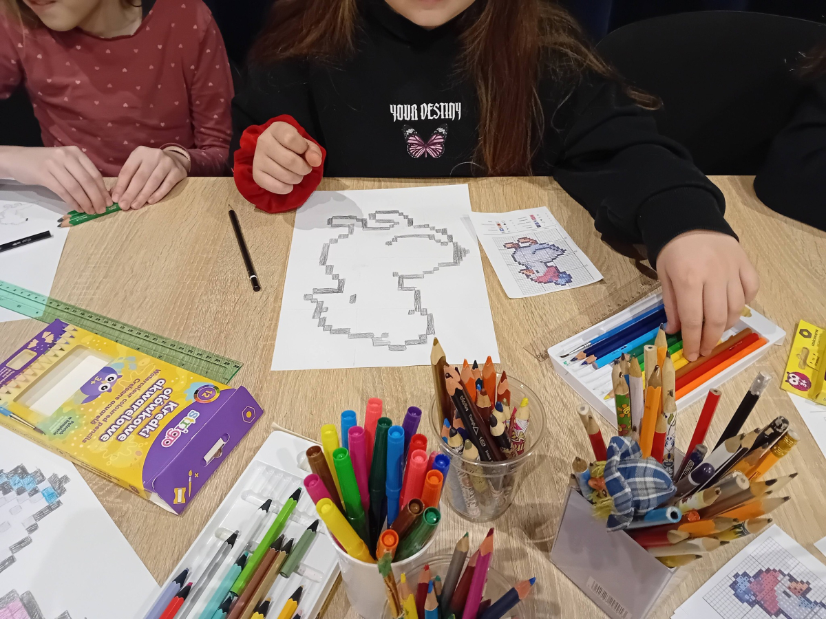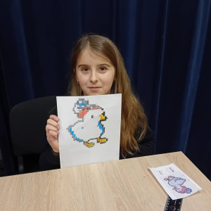 Na wczorajszych zajęciach plastycznych na dzieci czekało ciężkie zadanie - przerysować zimową kaczkę metodą kratek. Pomimo poziomu trudności dziewczyny świetnie sobie poradziły. Powstała kolekcja kolorowych kaczuszek, z których każda dostała zabawne imię, a z jednej nawet wyszedł dinozaur!