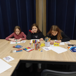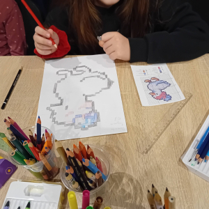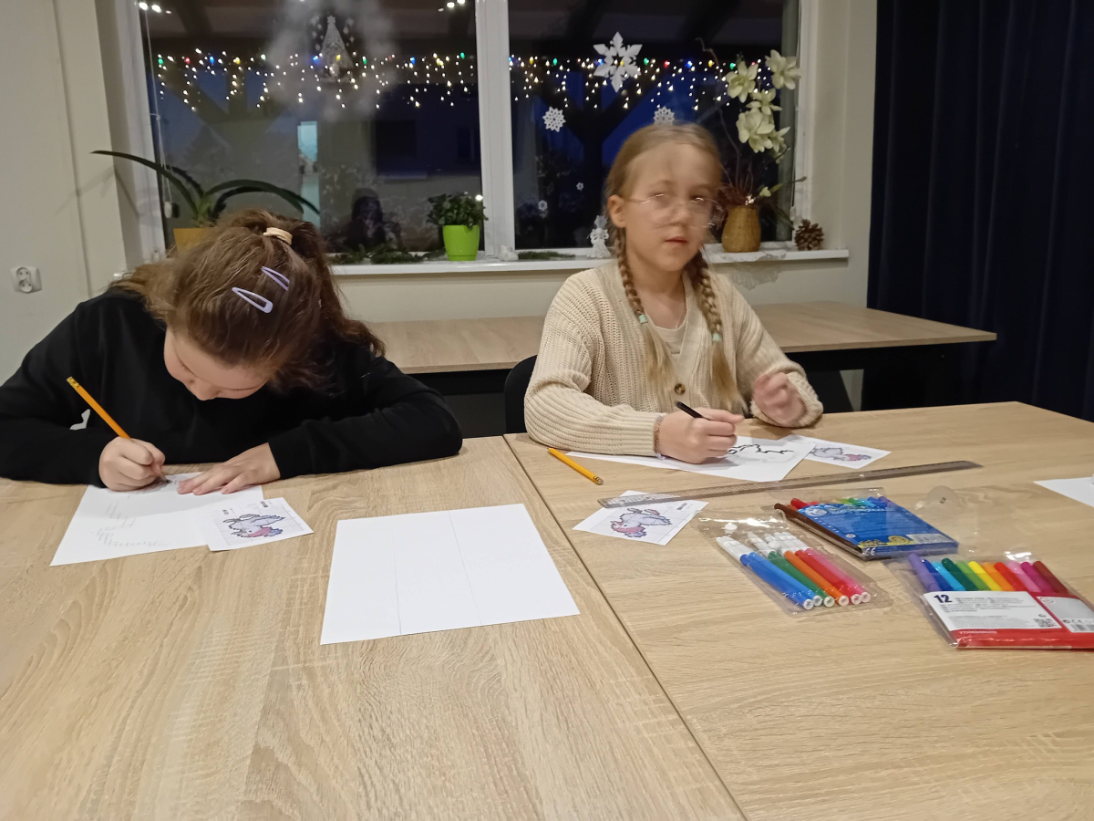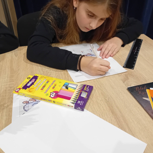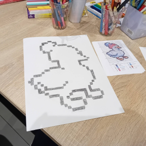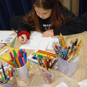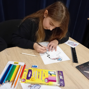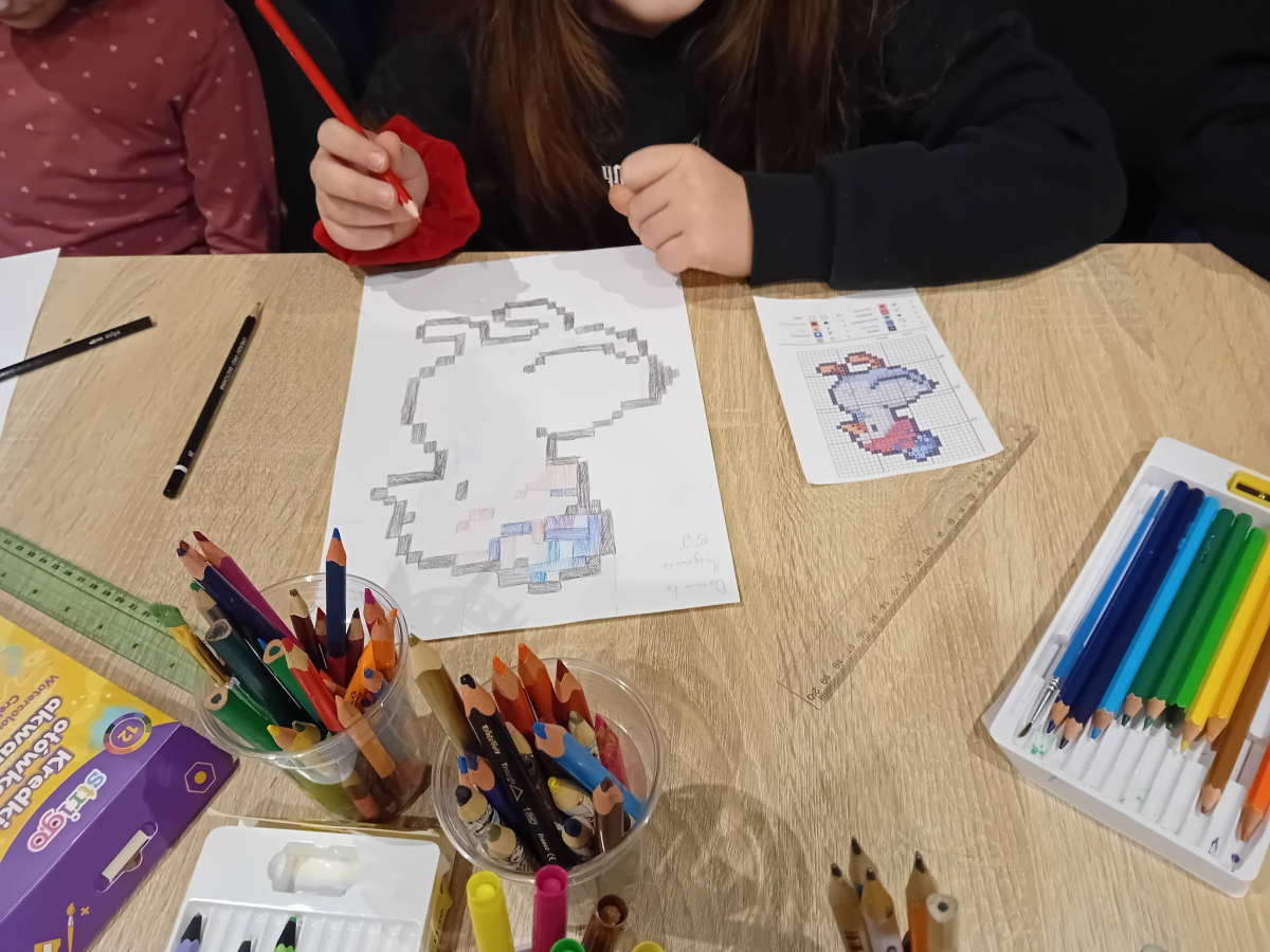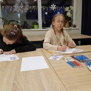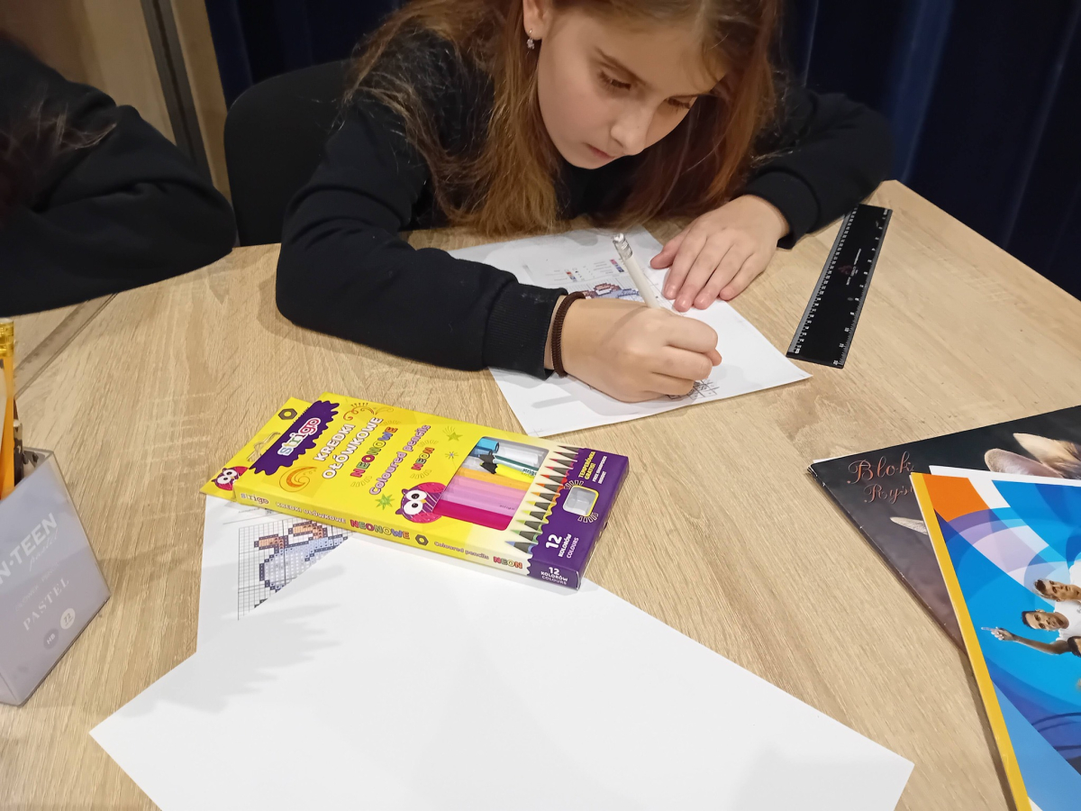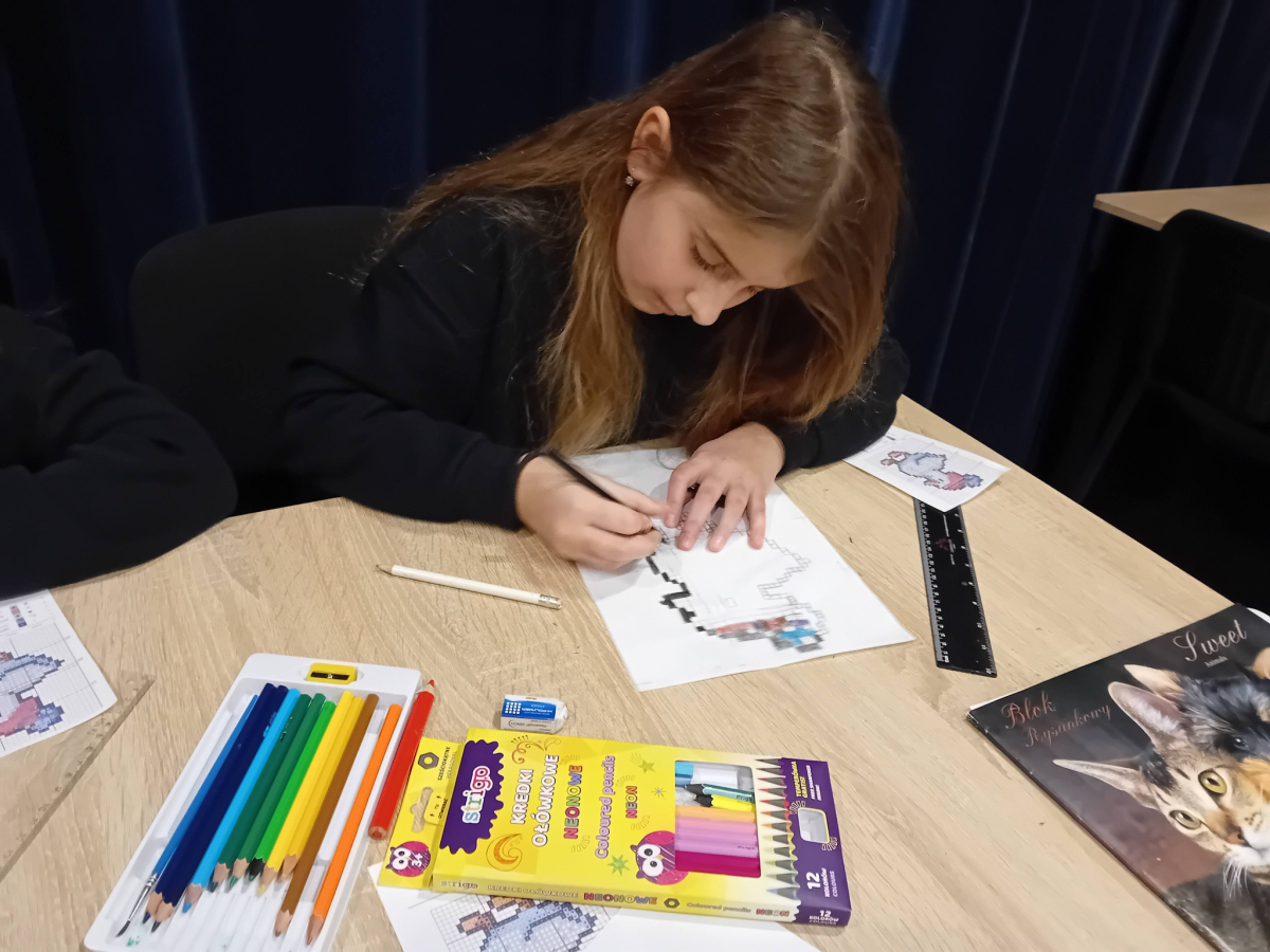 Na wczorajszych zajęciach plastycznych na dzieci czekało ciężkie zadanie - przerysować zimową kaczkę metodą kratek. Pomimo poziomu trudności dziewczyny świetnie sobie poradziły. Powstała kolekcja kolorowych kaczuszek, z których każda dostała zabawne imię, a z jednej nawet wyszedł dinozaur!