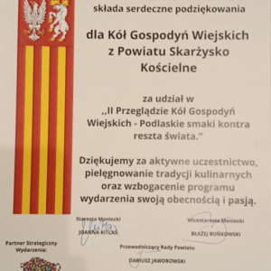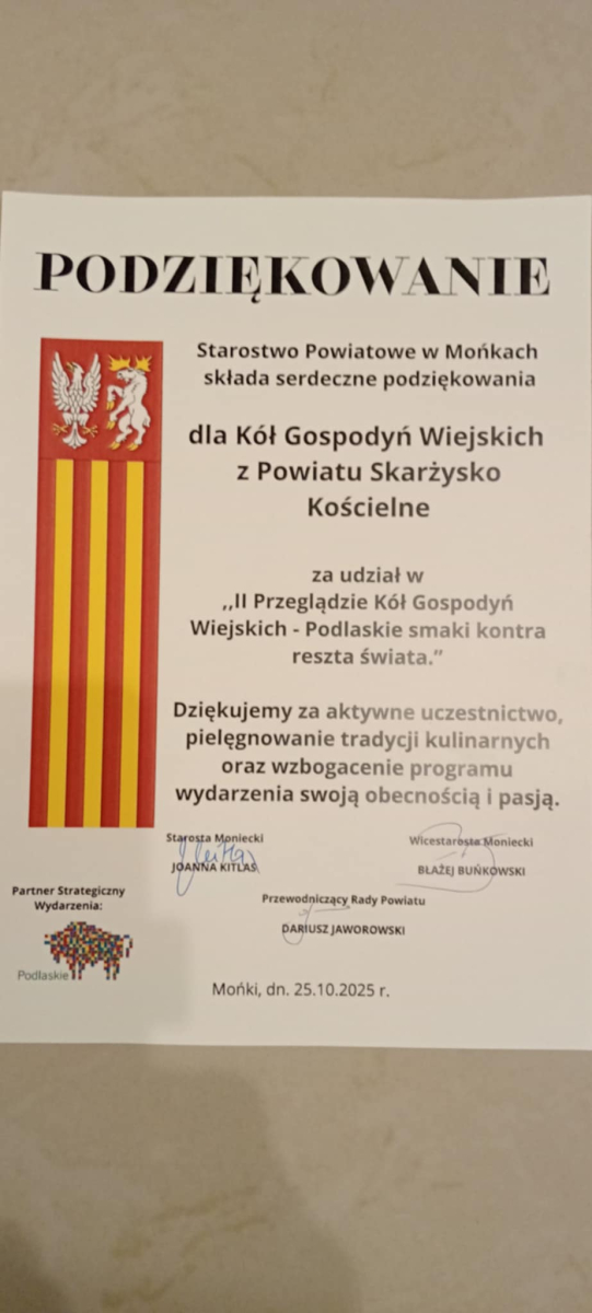W dniu 25 października 2025 r. KGW Skarżysko Kościelne wyjechało na II Przegląd Kół Gospodyń Wiejskich Powiatu Monieckiego - Podlaskie smaki kontra reszta świata. Spotkanie miało na celu integrację, wymianę doświadczeń, nawiązanie współpracy między kołami a także podniesienie wiedzy i umiejętności. Koło z naszej gminy promowało potrawy oraz napoje z tapinamburu. Była: zupa krem, rurki z kremem, topinambur kandyzowany i napój topinamburowy. Dziękujemy za godne reprezentowanie Województwa Świętokrzyskiego oraz pielęgnowanie tradycji kulinarnych.