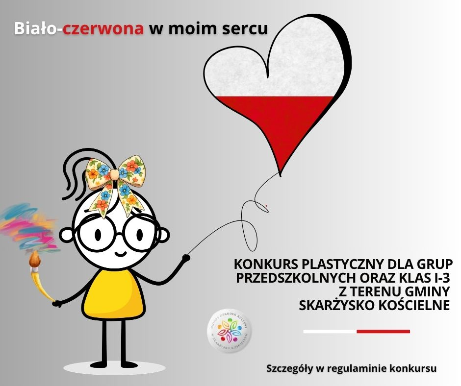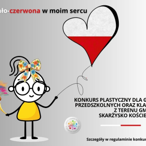 Zapraszamy dzieci z grup przedszkolnych oraz klas 1-3 do udziału w konkursie plastycznym organizowanym z okazji Dnia Flagi Rzeczpospolitej Polskiej pod hasłem "Biało-czerwona w moim sercu".