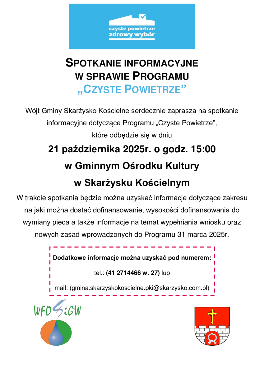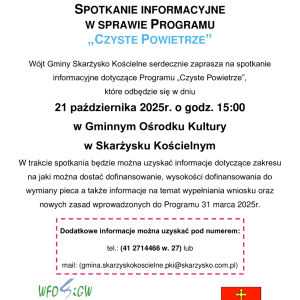 Wójt Gminy Skarżysko Kościelne serdecznie zaprasza na spotkanie informacyjne dotyczące Programu „Czyste Powietrze”,
