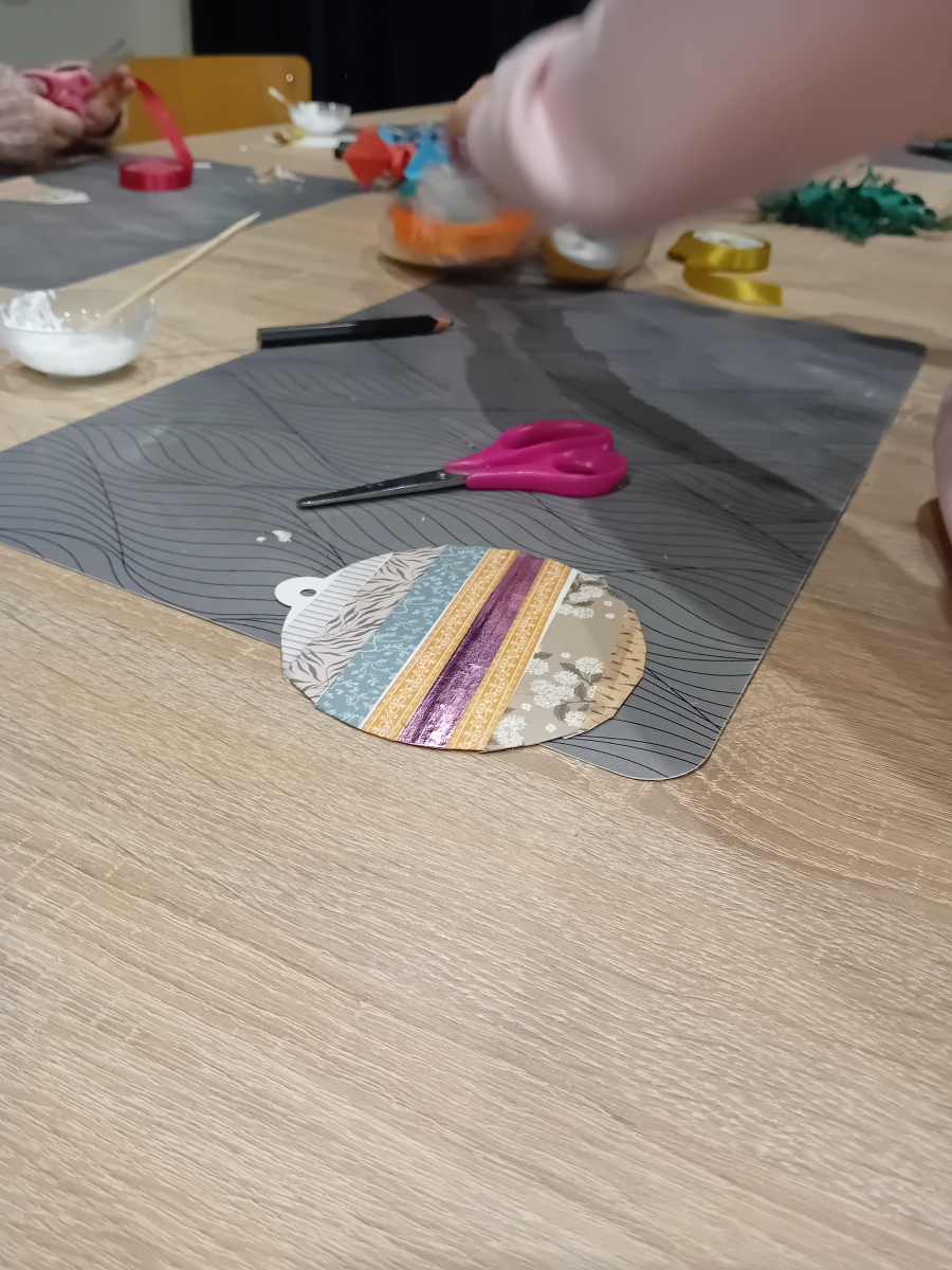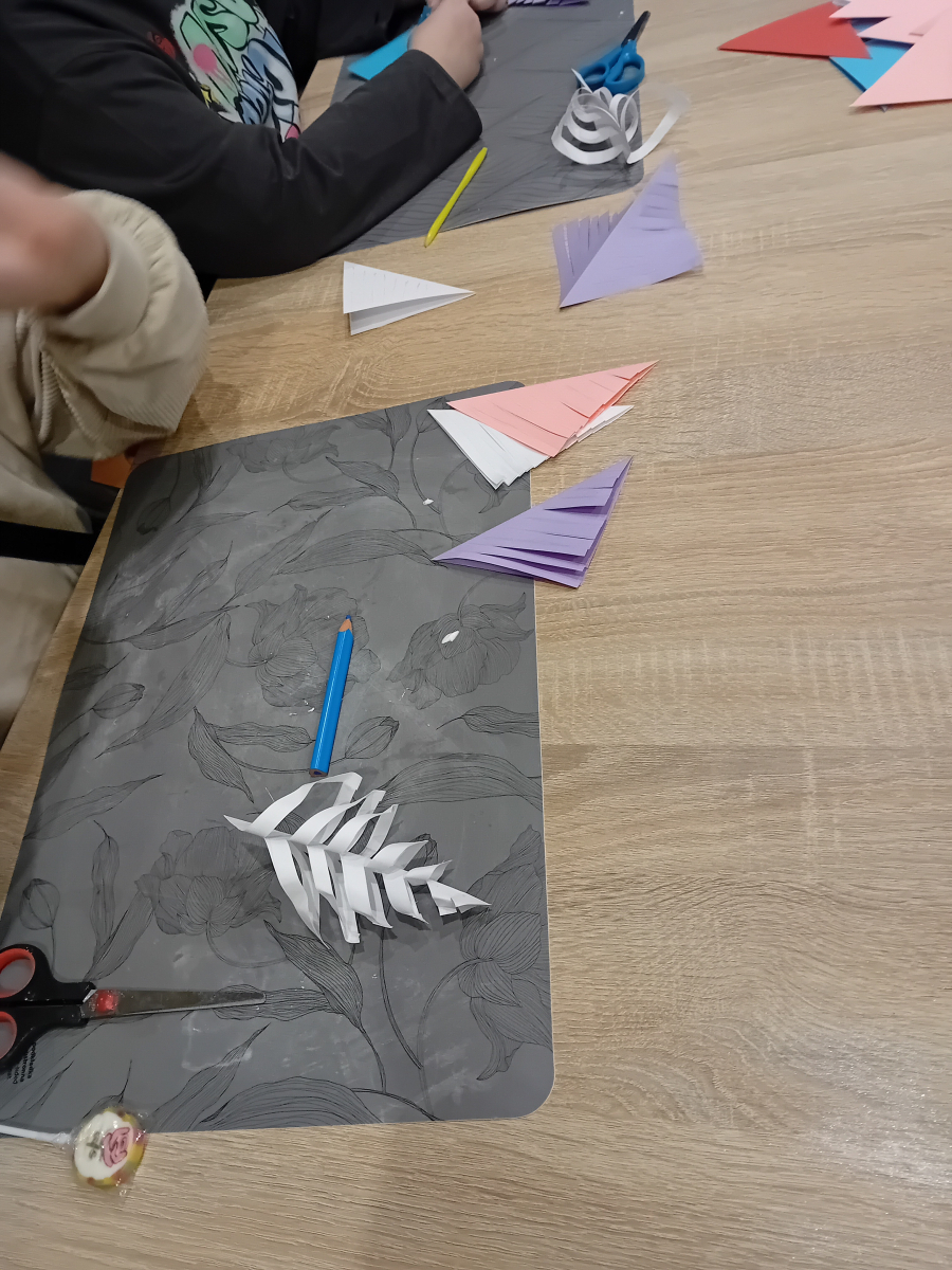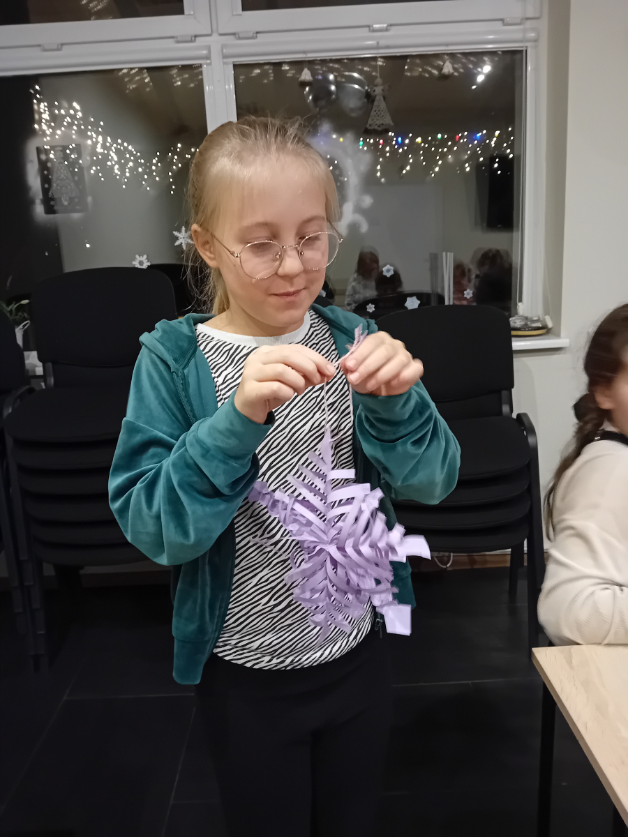 Na wczorajszych zajęciach najstarsza grupa plastyczna zmierzyła się z zadaniem skonstruowania gwiazdy świątecznej z papieru. Jak się okazało, wcale nie było to takie łatwe, jednak wszystkie dzieci skończyły na czas - powstało całkiem sporo ciekawych kombinacji kolorystycznych. Tym, którzy zrobili to migusiem, zostało jeszcze trochę siły na inne dekoracje m.in. oklejanie ozdobną taśmą gotowych szablonów z motywem świątecznym.