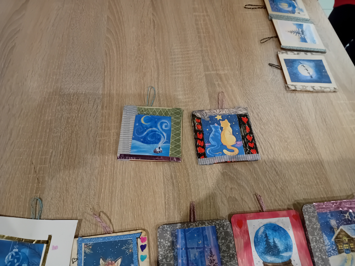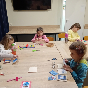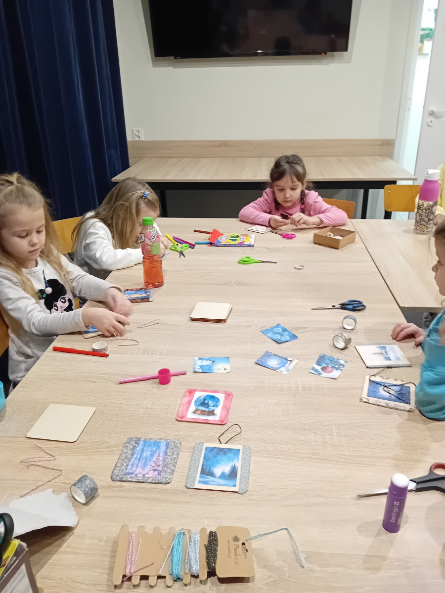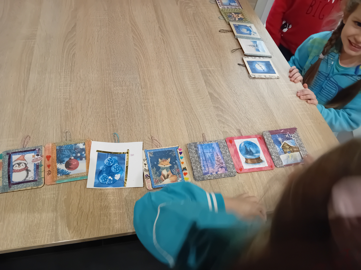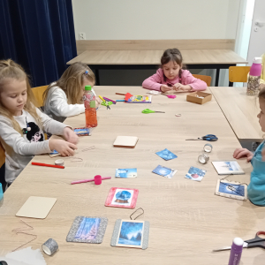 Na wczorajszych zajęciach plastycznych dla najmłodszej grupy dzieci robiły wiszące obrazki, czyli ozdoby idealne na choinkę czy do powieszenia nad łóżkiem . Każda dziewczynka zrobiła przynajmniej jeden, a co niektóre nawet i trzy!